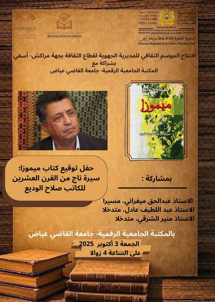 في إطار افتتاح موسمها الثقافي الجديد 2025-2026 تنظم المديرية الجهوية لقطاع الثقافة بجهة مراكش-آسفي، بشراكة مع المكتبة الجامعية الرقمية – جامعة القاضي عياض،حفل توقيع الإصدار الجديد للكاتب صلاح الوديع “ميموزا: سيرة ناج من القرن العشرين” وذلك يوم الجمعة 3 أكتوبر 2025 على الساعة الرابعة بعد الزوال بقاعة الندوات بالمكتبة الجامعية الرقمية.