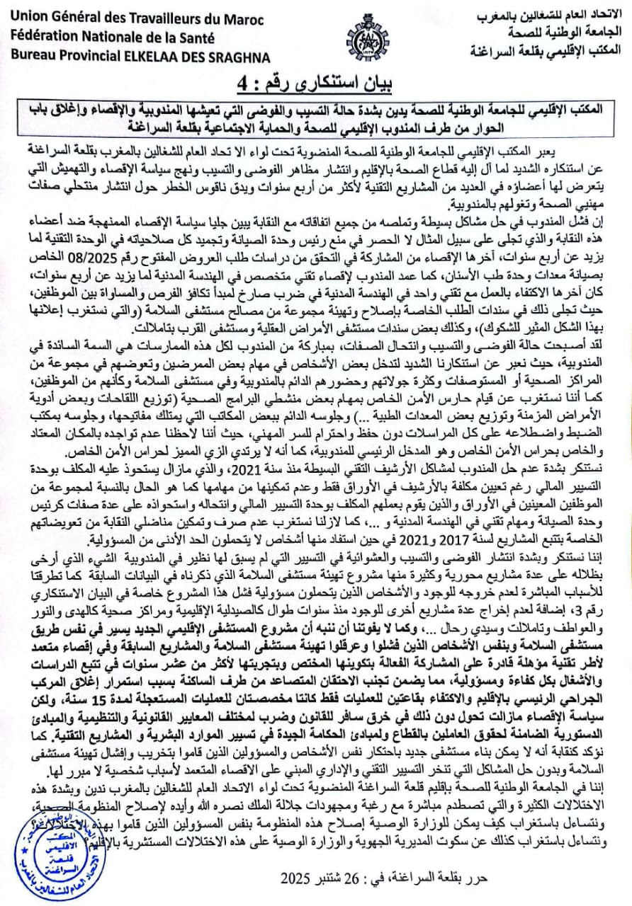 أعلن المكتب الإقليمي للجامعة الوطنية للصحة (إ.ع.ش.م) عن قلقه العميق مما وصفه بـ”الانهيار المستمر” الذي يعيشه قطاع الصحة بإقليم قلعة السراغنة، وذلك في بيان استنكاري جديد (رقم 4) توصلت به جريدة كلامكم.