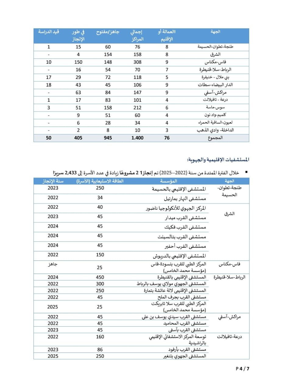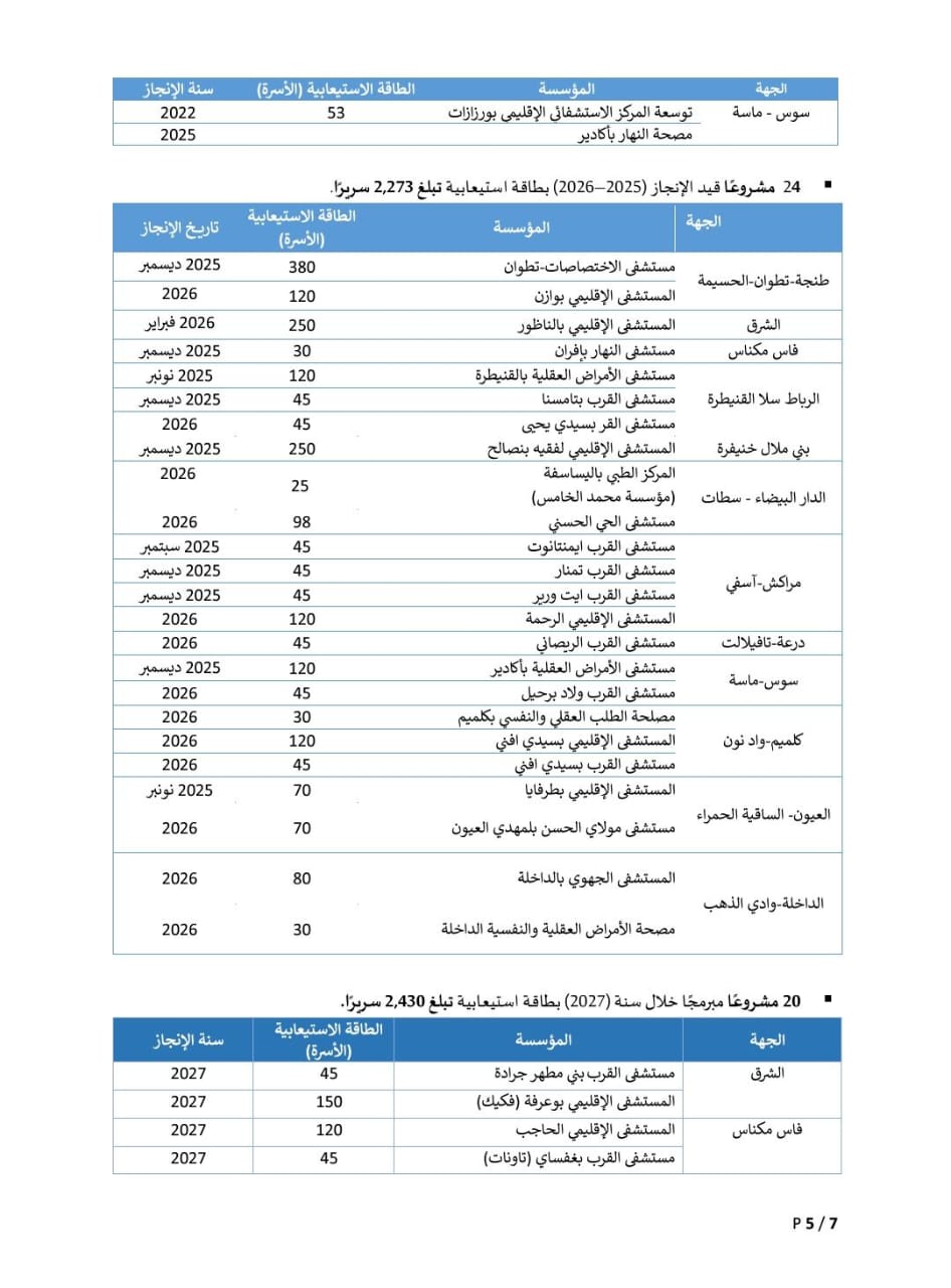 وفي هذا السياق، يعرض التقرير أهم المؤشرات الكمية والنوعية المسجلة في مجال البنيات التحتية والمستشفيات الجديدة، حيث تم خلال الفترة الممتدة من 2022 إلى 2025 إنجاز 21 مشروعاً استشفائياً ساهم في رفع الطاقة الاستيعابية للمستشفيات إلى 2.433 سريراً جديداً، إلى جانب مواصلة الأشغال في مشاريع مهيكلة بمختلف جهات المملكة.
