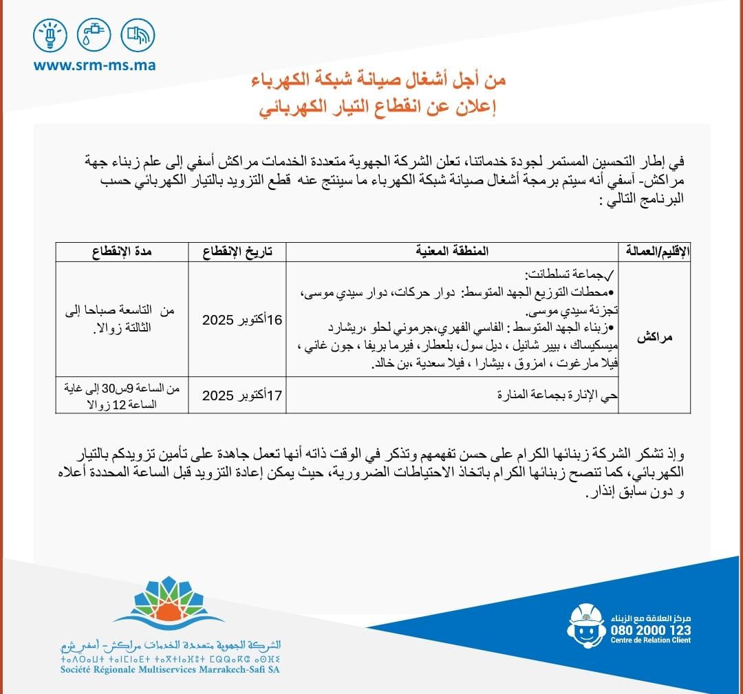 الرئيسيةبلاحدود الشركة الجهوية تعلن عن انقطاع الكهرباء بمراكش وهذه الأحياء المعنية الشركة الجهوية تعلن عن انقطاع الكهرباء بمراكش وهذه الأحياء المعنية بواسطة كلامكم - 15 أكتوبر، 2025 - فيبلاحدود, في الواجهة 94 التعليقات على الشركة الجهوية تعلن عن انقطاع الكهرباء بمراكش وهذه الأحياء المعنية مغلقة