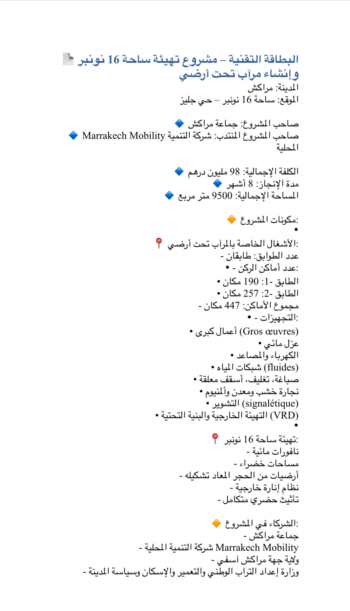 المشروع يُنجز في إطار شراكة مؤسساتية بين جماعة مراكش، ومجلس جهة مراكش آسفي، وولاية الجهة، ووزارة إعداد التراب الوطني والتعمير والإسكان وسياسة المدينة، فيما تتولى شركة التنمية المحلية “مراكش موبيليتي” مهمة الإشراف على التنفيذ.