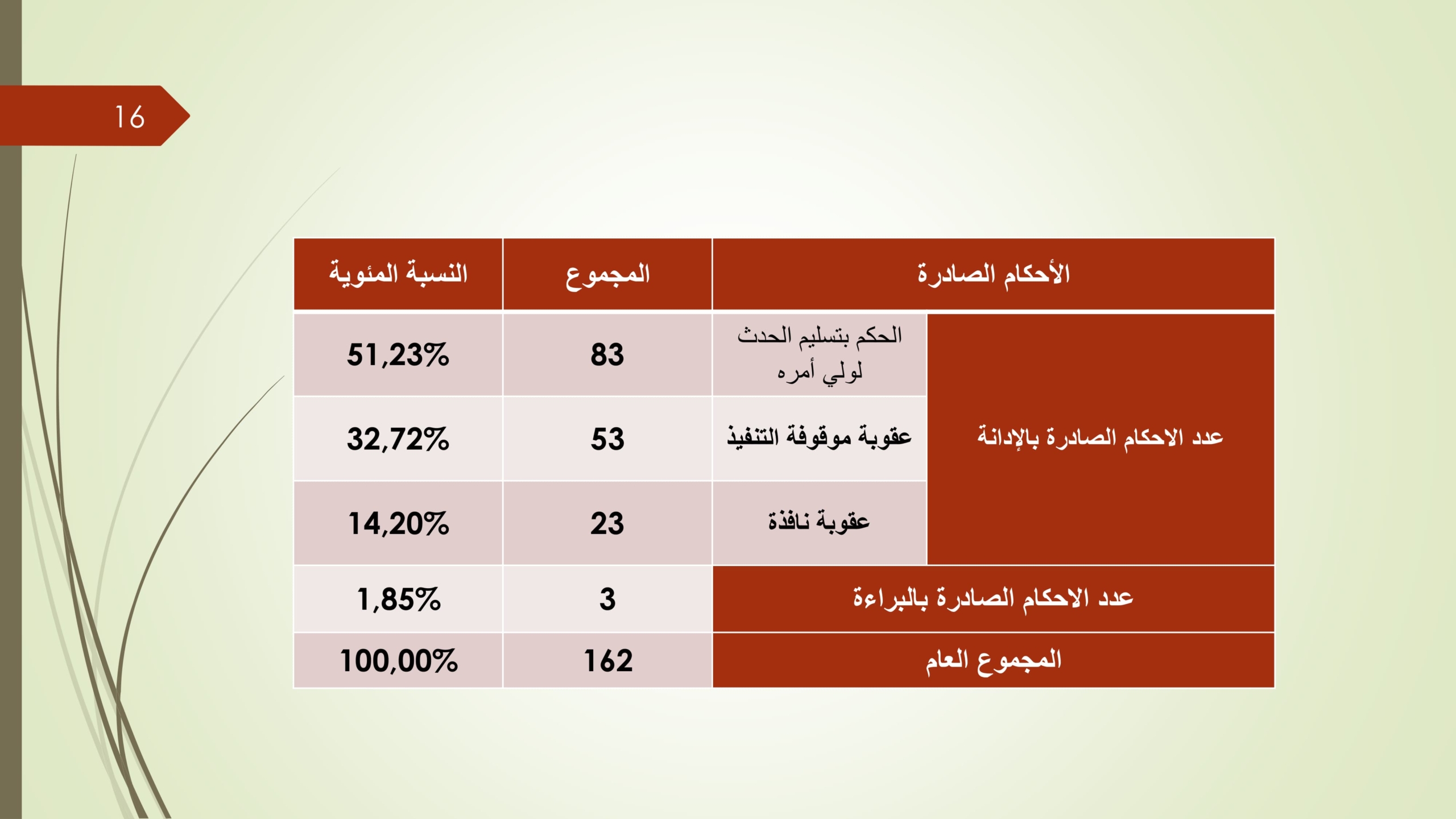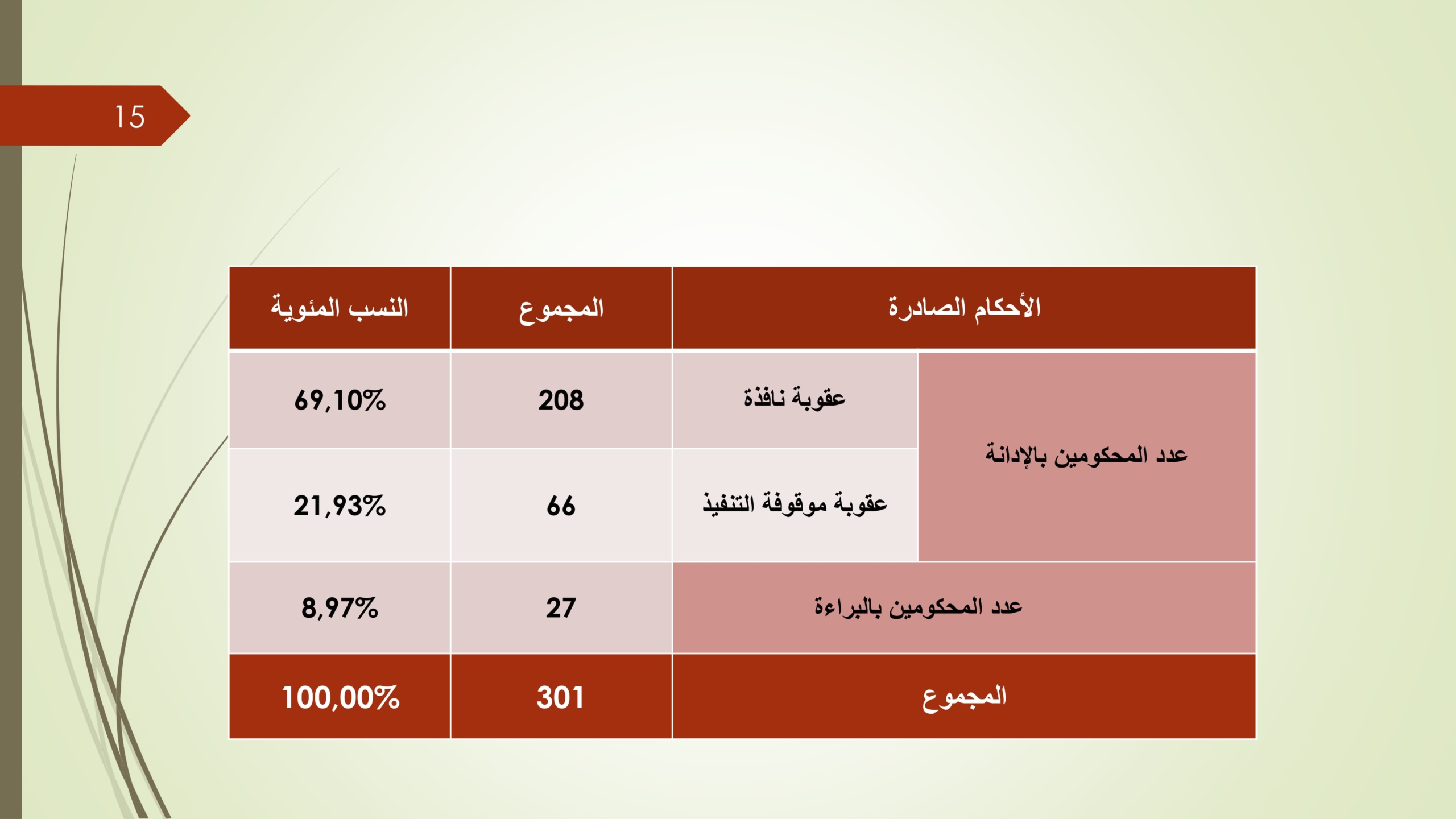 وخلص السيد فرحان إلى أنه يتبين من خلال هذه المعطيات الإحصائية أن عدد الأحكام الصادرة بالبراءة بلغت على مستوى المحاكم الابتدائية 30 حكما، أي ما يمثل 11,4 في المائة، من مجموع الأحكام الصادرة عن هذه المحاكم، فيما وصل عدد القرارات الصادرة بالبراءة على مستوى محاكم الاستئناف 04 قرارات، أي ما يمثل 9,7 في المائة من مجموع القرارات الصادرة عن هذه المحاكم لغاية الآن.