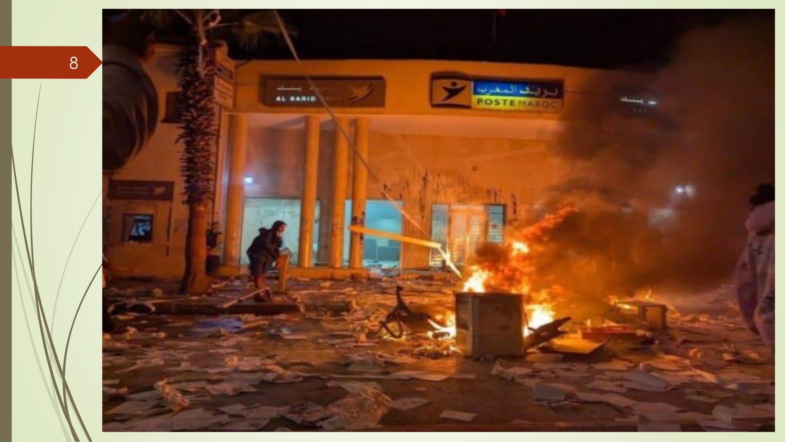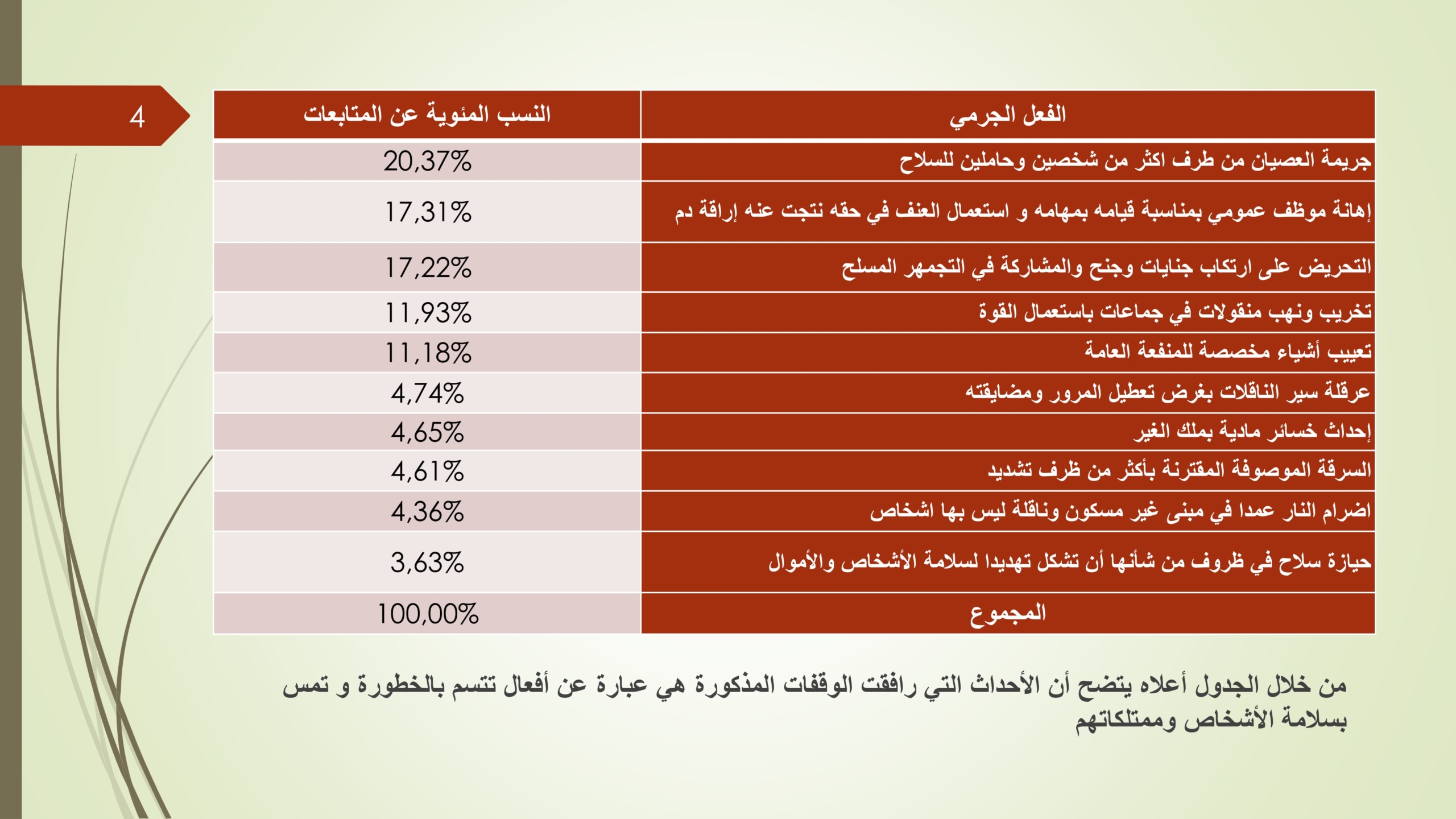 وأوضح أن هذه الجرائم تتعلق بالعصيان من طرف أكثر من شخصين وحاملين للسلاح، وإهانة موظف عمومي بمناسبة قيامه بمهامه واستعمال العنف في حقه نتجت عنه إراقة دم، والتحريض على ارتكاب جنايات وجنح والمشاركة في التجمهر المسلح، وتخريب ونهب منقولات في جماعات باستعمال القوة.