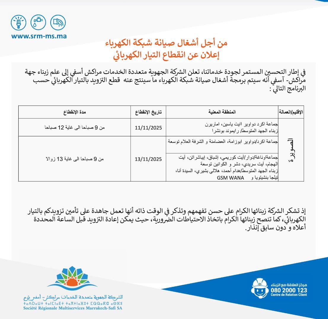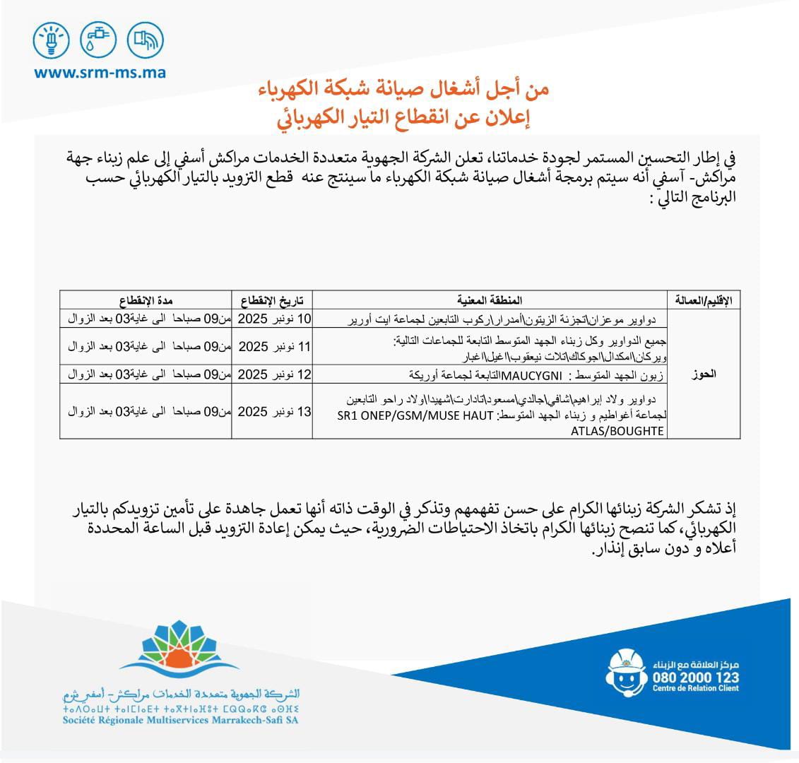 الرئيسيةفي الواجهة الشركة الجهوية بمراكش تعلن عن انقطاع الكهرباء بالحوز والصويرة الشركة الجهوية بمراكش تعلن عن انقطاع الكهرباء بالحوز والصويرة بواسطة كلامكم - 10 نوفمبر، 2025 - فيفي الواجهة, مجتمع 82 0 إعلان إضافة تعليقلن يتم نشر عنوان بريدك الإلكتروني. الحقول الإلزامية مشار إليها بـ * احفظ اسمي، بريدي الإلكتروني، والموقع الإلكتروني في هذا المتصفح لاستخدامها المرة المقبلة في تعليقي. Δ