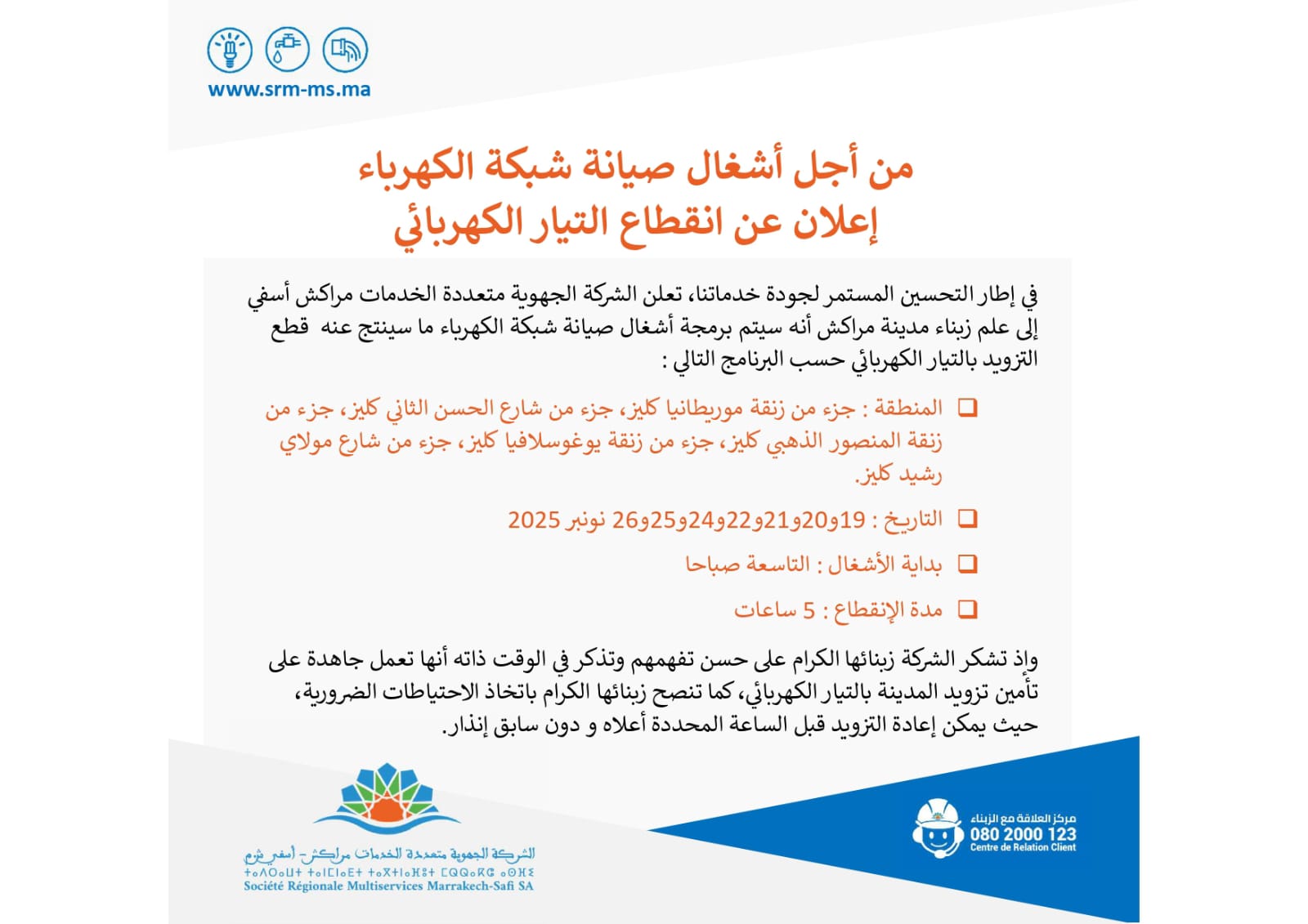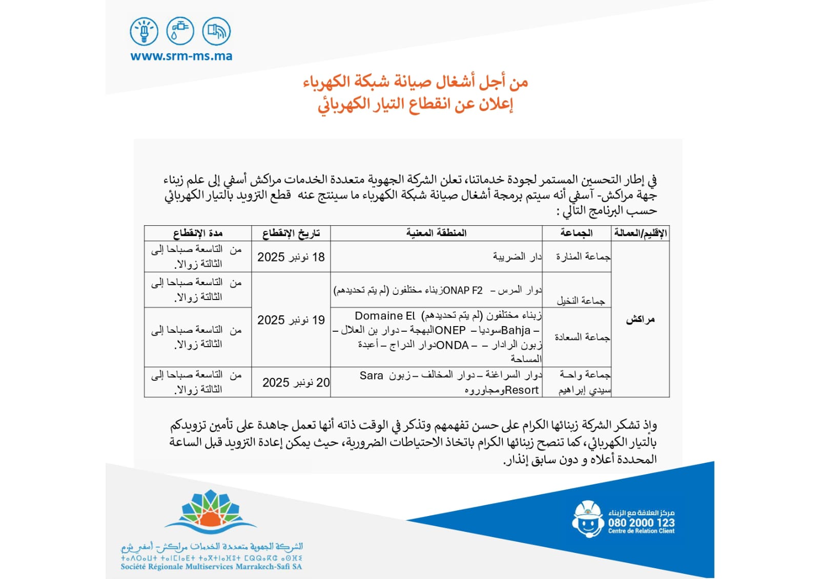 الشركة الجهوية بمراكش تعلن عن انقطاع الكهرباء بهذه الأحياء