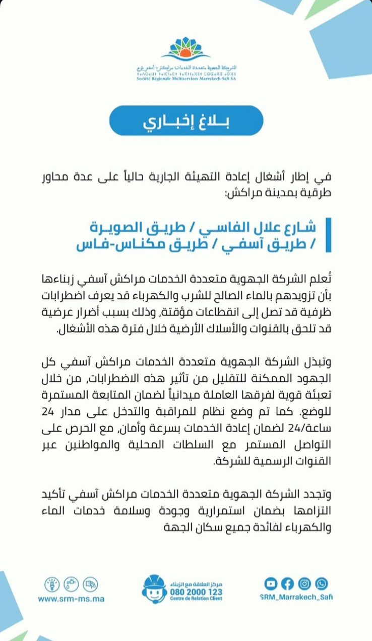تعلم الشركة الجهوية متعددة الخدمات مراكش آسفي قاطني وزوار مدينة مراكش الكرام بـانطلاق أعمال تهيئة وصيانة كبرى على محاور طرقية محددة. وتوضح الشركة في هذا البلاغ الإخباري التدابير المتخذة لضمان استمرارية الخدمات الأساسية، رغم ما قد تسببه هذه الأشغال من اضطرابات مؤقتة في التزويد بالماء الصالح للشرب والكهرباء.