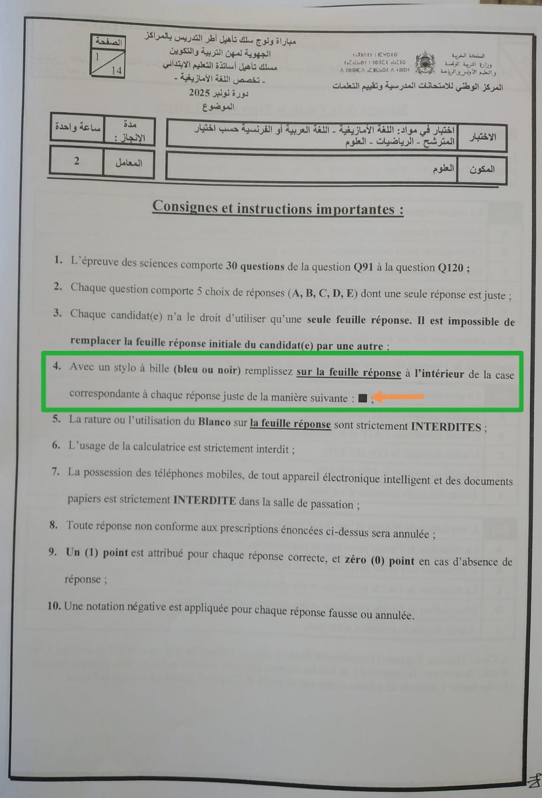شهدت مباراة توظيف أطر الأكاديميات دورة نونبر 2025 حالة ارتباك واسعة في صفوف عدد من المترشحين، بعد تضارب التعليمات المتعلقة بطريقة تأشير الإجابات في الامتحان، حيث ورد في ورقة الامتحان ضرورة “تلوين المربع” المخصص للإجابة بشكل كامل، في حين تنص ورقة الأجوبة على ضرورة “وضع علامة داخل المربع دون الخروج عنه”.