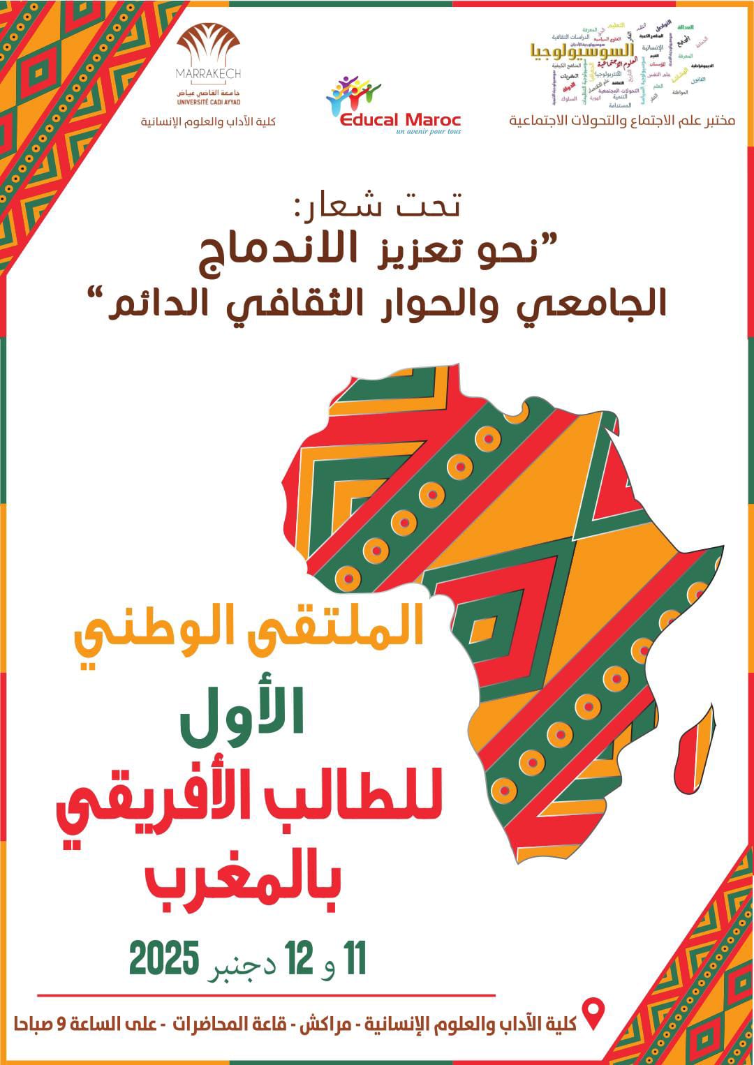تستعد كلية الآداب والعلوم الإنسانية التابعة لجامعة القاضي عياض بمراكش لاحتضان المنتدى الوطني للطالب الإفريقي بالمغرب يومي 11 و12 دجنبر 2025، تحت شعار: «من أجل اندماج جامعي وحوار ثقافي مستدام».
