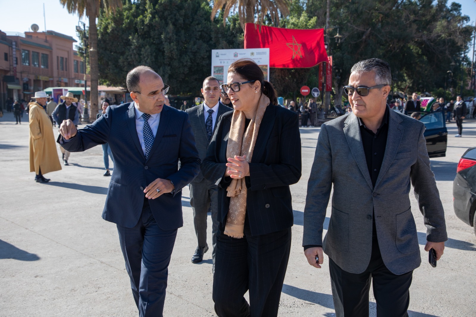 بعد ذلك، انتقلت المنصوري إلى ساحة جامع الفنا، القلب النابض لمراكش وأيقونتها العالمية، حيث قامت بجولة ميدانية لمتابعة أشغال التهيئة الجارية، خصوصاً ما يتعلق بالبنية الأرضية والتجهيزات المرتبطة بالسلامة وجودة المسار السياحي. وركزت السيدة العمدة خلال زيارتها على ضرورة احترام الجدول الزمني للأشغال وضمان مطابقتها للمعايير التقنية، حفاظاً على الطابع التاريخي للساحة ومكانتها الاقتصادية.