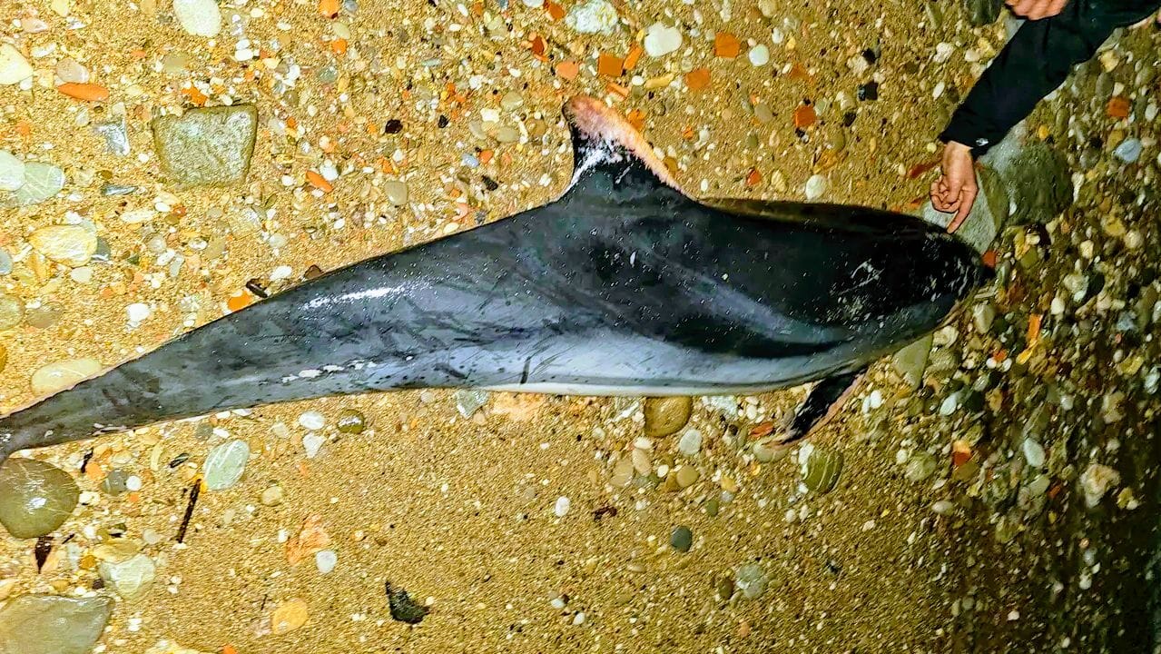 ويبلغ طول الدلفين النافق نحو متر واحد، ويُرجح أنه فارق الحياة منذ ساعات قليلة قبل أن تجرفه الأمواج نحو الشاطئ، دون أن تظهر عليه آثار صيد أو إصابات واضحة.