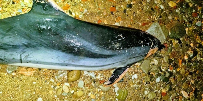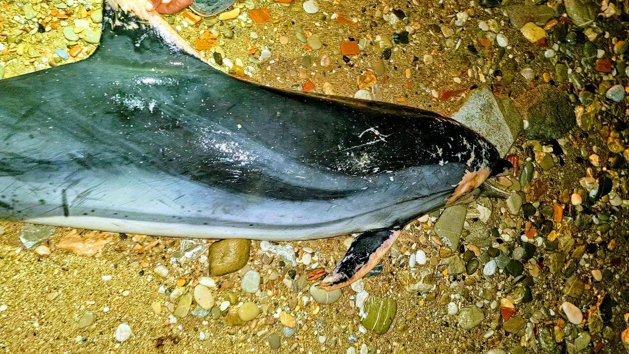 ويبلغ طول الدلفين النافق نحو متر واحد، ويُرجح أنه فارق الحياة منذ ساعات قليلة قبل أن تجرفه الأمواج نحو الشاطئ، دون أن تظهر عليه آثار صيد أو إصابات واضحة.