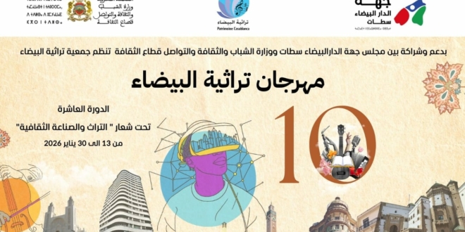 تثمينًا لعقد كامل من العمل الثقافي المتواصل، وتتويجًا لمسار راكم التجربة والأثر، تُعلن تراثية البيضاء عن انطلاق الدورة العاشرة من مهرجان تراثية البيضاء، وذلك خلال الفترة الممتدة من 13 إلى 30 يناير 2026 بمختلف عمالات واقاليم جهة الدار البيضاء – سطات، في حدث ثقافي استثنائي يحمل شعار «التراث والصناعة الثقافية»، ويُنظَّم بشراكة استراتيجية مع مجلس جهة الدار البيضاء – سطات ووزارة الشباب والثقافة والتواصل، قطاع الثقافة. وتكتسي هذه الدورة بُعدًا رمزيًّا بالغ الأهمية، إذ تُجسّد عشر سنوات من الالتزام بصون الذاكرة الجماعية، وإعادة الاعتبار للتراث الثقافي البيضاوي والمغربي في أبعاده المادية واللامادية، مؤكدةً أن الفعل الثقافي حين يُبنى على التراكم والاستمرارية يصبح قادرًا على إحداث تحوّل حقيقي في علاقة المجتمع بموروثه الحضاري.
