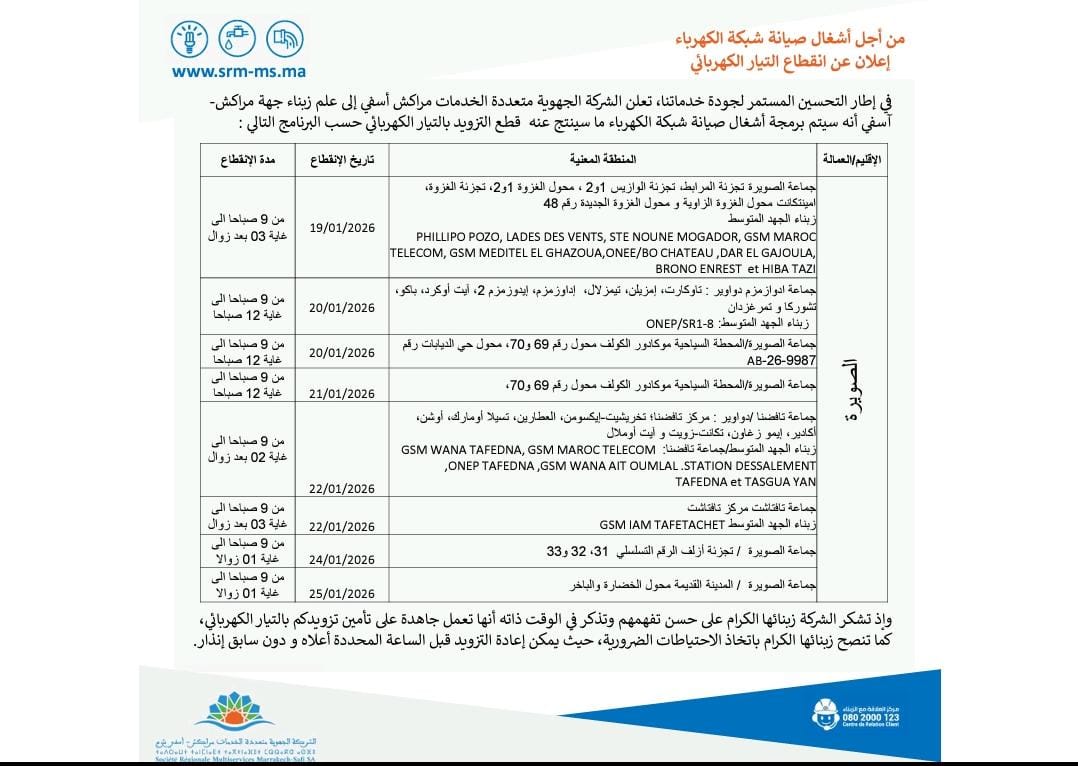 إعلان عن اقطاع التيار الكهربائي بهذه الأحياء بالصويرة