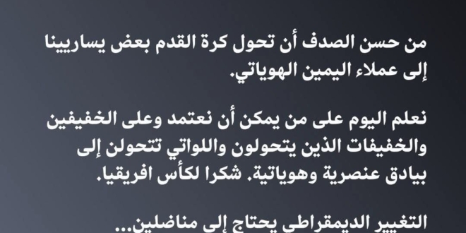 التعميم هنا أخطر من “الهوليغانز” أنفسهم. تحويل كرة القدم إلى شماعة لتصفية حسابات إيديولوجية رخيصة، ووصم جماهير كاملة بالعنصرية واليمن المتطرف، هو كسل فكري قبل أن يكون موقفًا سياسياً. كرة القدم فضاء شعبي متنوع، فيه الواعي وفيه الغاضب وفيه البسيط، لكن من يختزلها في “خفيفين وخفافيش” إنما يكشف عن احتقار طبقي مقنّع أكثر مما يكشف عن وعي ديمقراطي.