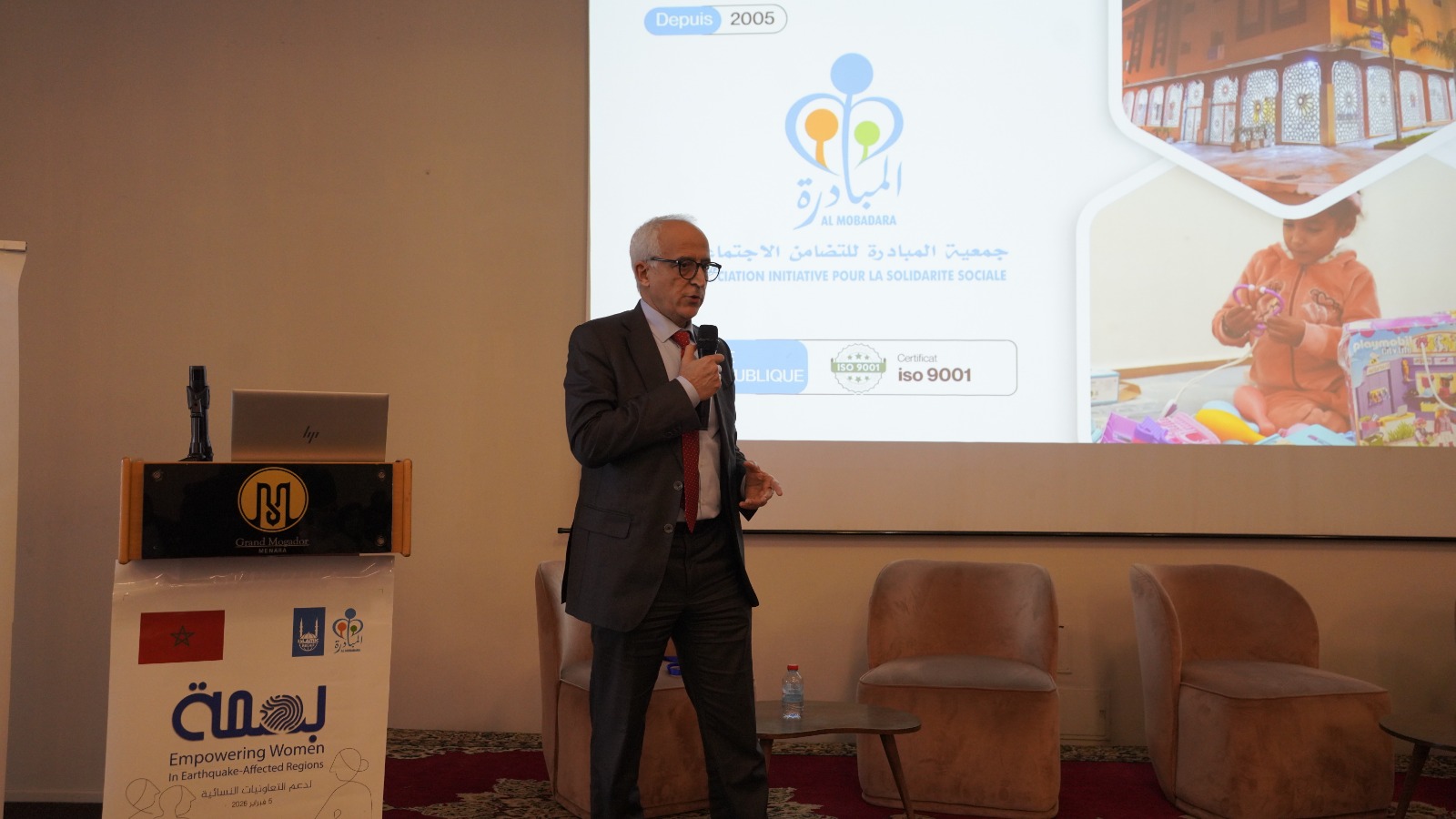 وفي كلمته الافتتاحية، عرض رئيس جمعية المبادرة للتضامن الاجتماعي، السيد الطيب أعيس، فكرة مشروع «بصمة» وسياقه العام، مبرزا السياق العملي الانساني للجمعية وخاصة بعد الزلزال مباشرة والذي تمثل في تدخلات إغاثية عاجلة، شملت الاستعانة بفريق متخصص للمساهمة في إغاثة العالقين تحت الأنقاض، وتوفير الرعاية للمتضررين من خلال توفير الخيام و الغداء والدواء والتطبيب، قبل الانتقال إلى مرحلة إعادة بناء المساكن لفائدة المتضررين، إذ أطلقت الجمعية برنامجا يشمل في مرحلته الأولى بناء 300 منزل ويأمل أن يصل في المرحلة الأخيرة إلى 1000 منزل بحول الله. وكما أكد المتحدث أن هذا المسار الإنساني تطور بشكل طبيعي نحو قناعة راسخة مفادها أن التعافي الحقيقي لا يكتمل دون تمكين المتضررين اقتصاديا واجتماعيا، وهو ما تجسد في إطلاق برنامج «بصمة» كرافعة للتنمية المستدامة.