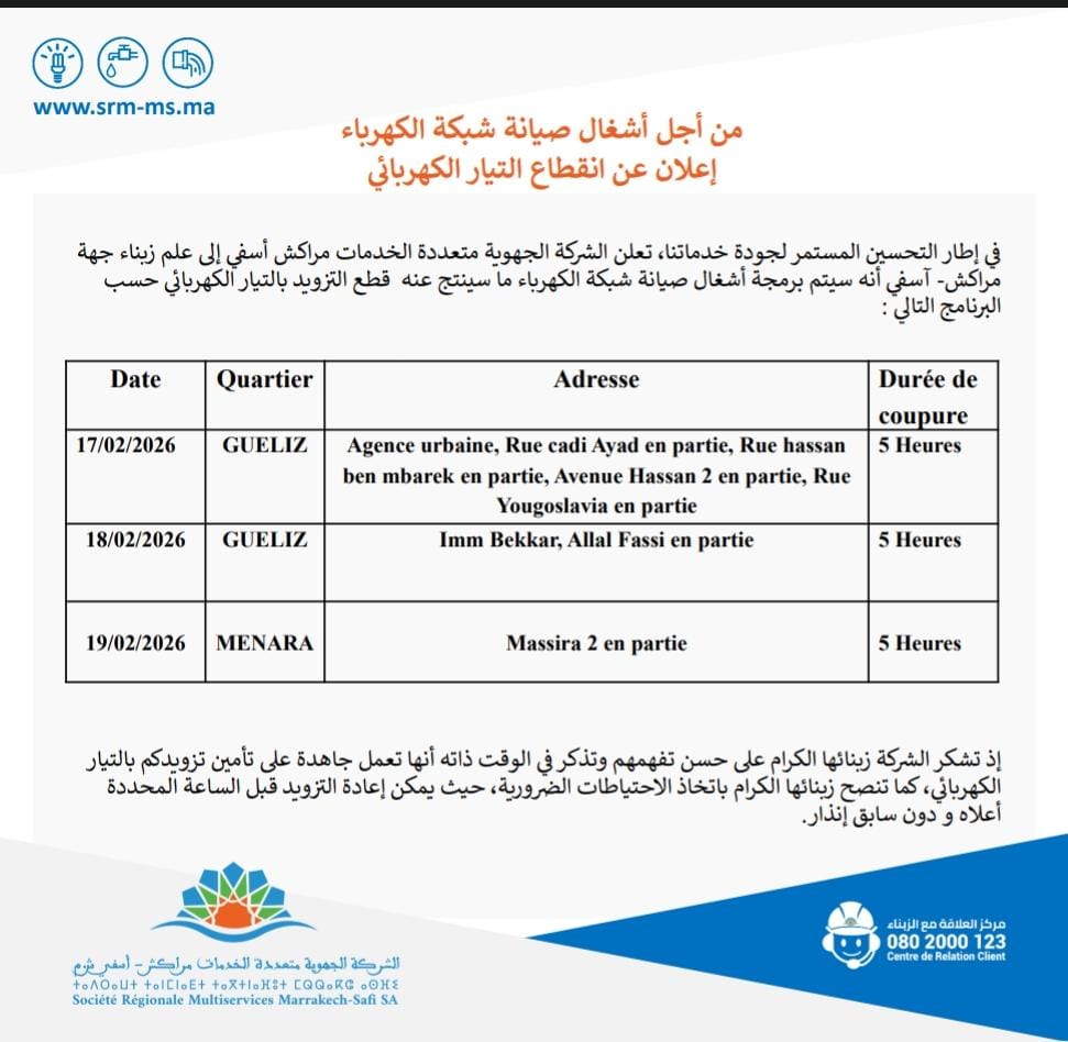 الرئيسيةبلاحدود إعلان عن انقطاع التيار الكهربائي بهذه الأحياء بمراكش إعلان عن انقطاع التيار الكهربائي بهذه الأحياء بمراكش بواسطة كلامكم - 16 فبراير، 2026 - فيبلاحدود 6028 التعليقات على إعلان عن انقطاع التيار الكهربائي بهذه الأحياء بمراكش مغلقة إعلان
