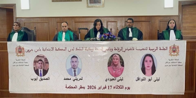 احتضنت المحكمة الابتدائية بمدينة ابن جرير، صباح اليوم الثلاثاء 17 فبراير 2026، جلسة رسمية خُصصت لتنصيب قضاة جدد، وذلك في إطار تعزيز الموارد البشرية بالجهاز القضائي ودعم النجاعة القضائية والرفع من جودة الخدمات المقدمة للمتقاضين.