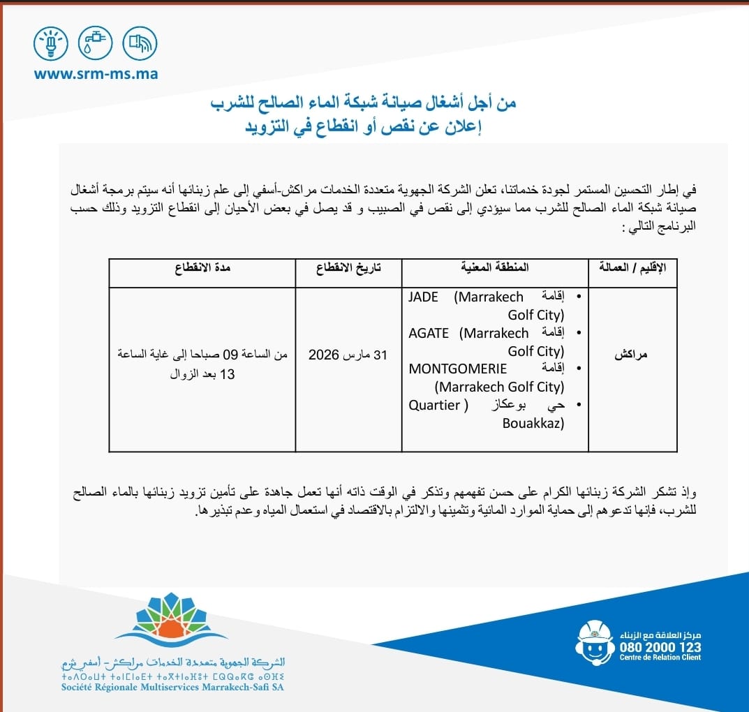 الرئيسيةبلاحدود إعلان عن انقطاع محتمل للماء الصالح للشرب بمراكش إعلان عن انقطاع محتمل للماء الصالح للشرب بمراكش بواسطة كلامكم - 30 مارس، 2026 - فيبلاحدود 3882 التعليقات على إعلان عن انقطاع محتمل للماء الصالح للشرب بمراكش مغلقة إعلان