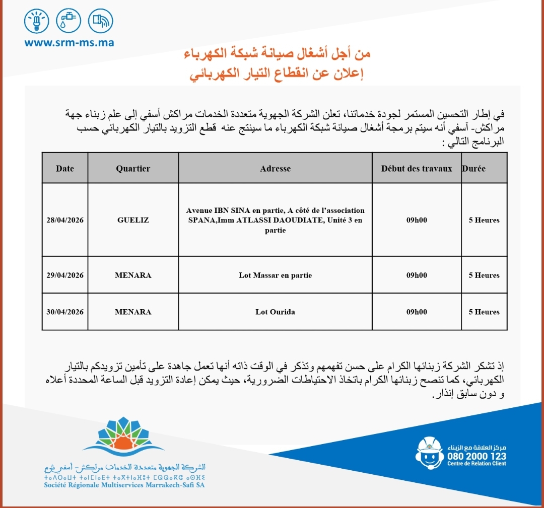 الرئيسيةبلاحدود إعلان عن انقطاع التيار الكهربائي بهذه الأحياء بمراكش إعلان عن انقطاع التيار الكهربائي بهذه الأحياء بمراكش بواسطة كلامكم - 27 أبريل، 2026 - فيبلاحدود 4002 التعليقات على إعلان عن انقطاع التيار الكهربائي بهذه الأحياء بمراكش مغلقة إعلان